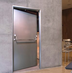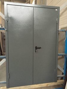 В двустворчатой конструкции используются два сплошных полотна шириной до 160 см. Эти двери предназначены для широких проемов. Они выдерживают открытое пламя и защищают помещение от вредных веществ, возникающих при горении.